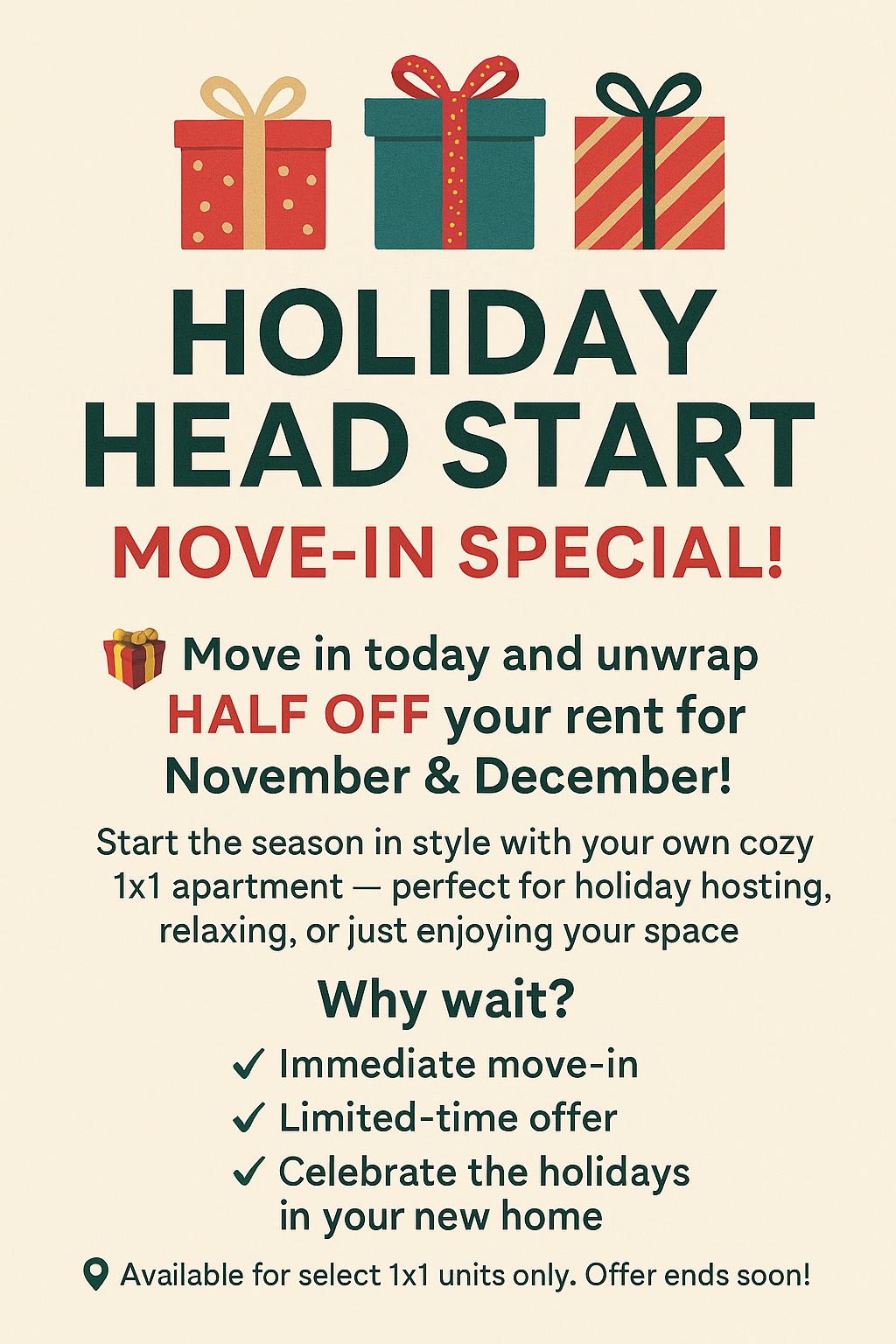 Move in now and make this holiday season truly feel like home. Hurryβthis limited-time offer wonβt last past the leftovers!